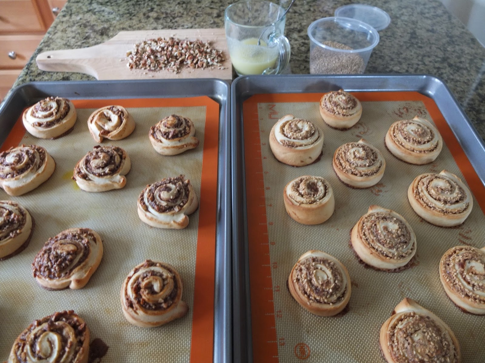 Die Schnecken, die Nina aufs Blech drapiert hat sehen viel ordentlicher aus als meine...aber ich glaube, meine Füllung war auch flüssiger! ;-) Die Schnecken ca. 20 min bei Umluft bei 180°C oder 350°F goldbraun backen.