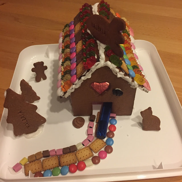 Wenn man mit einem Plätzchenstempel Namen der Haus-Eigentümer einstempelt, kann man eine Rakete oder Sternschnuppe mit Namen auf den Giebel des Hauses setzen. Dafür und fürs Aufstellen der Aussteller braucht man viel Royal Icing - ein Rezept Royal Icing reicht normalerweise ganz genau für ein Teigrezept, auch wenn es immer knapp aussieht, bleibt für den Zucker-gepflasterten Weg ins Haus am Schluss doch noch genug übrig.